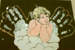 handafdruk op een vel zwart papier. Plak de afbeelding van de engel er op , zo krijgt de engel ' vleugeltjes".